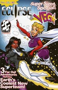 This 60-page, full-color comic from SSS Comics features so much red hot super-heroine action and tongue-in-cheek humor that you’ll have to take a nap after reading it! Yambar pens half the book and not only offers a look at the secrets behind the origin of Eclipse and Vega but goes into overdrive providing a romp that includes killer robots, a scad of truly twisted super villains, a flying saucer filled with alien turtles, some demonic monsters from hell, an appearance by Packaging Man, and a night out at the most high-tech space disco in this or any other galaxy! Great fun for readers looking for some very cool ‘good girl’ comic reading. A complete stand- alone issue! Created by the infamously hip Saul Colt! Cover art by our pals Bill Morrison and colorist / interior artist Bill Jankowski.